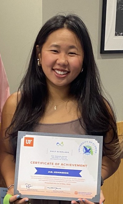 Jia bridged science and technology in her Gulf Impact Project, Tracking Change in Florida’s Commercial Fisheries. Using data science methods, Jia analyzed trends in fisheries over time to better understand how climate change and policy shifts are reshaping one of the Gulf’s most vital industries. Her interdisciplinary approach highlights the value of combining field research with digital tools.